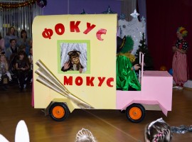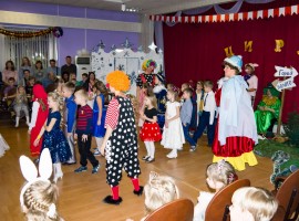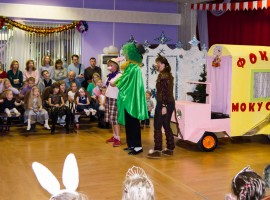 Сценарий сказки и тематика каждый раз новые, за образ главного персонажа в основном берется символ наступающего года. В этом году наш праздник назывался «Новогодние приключения поросенка Фунтика». Все помнят этот добрый советский мультфильм, поэтому и тематика сказки  - цирк. Придя в зал, дети попадали в цирк-шапито, по крайней мере, мы старались приблизить декорации и украшения зала к особой цирковой атмосфере.