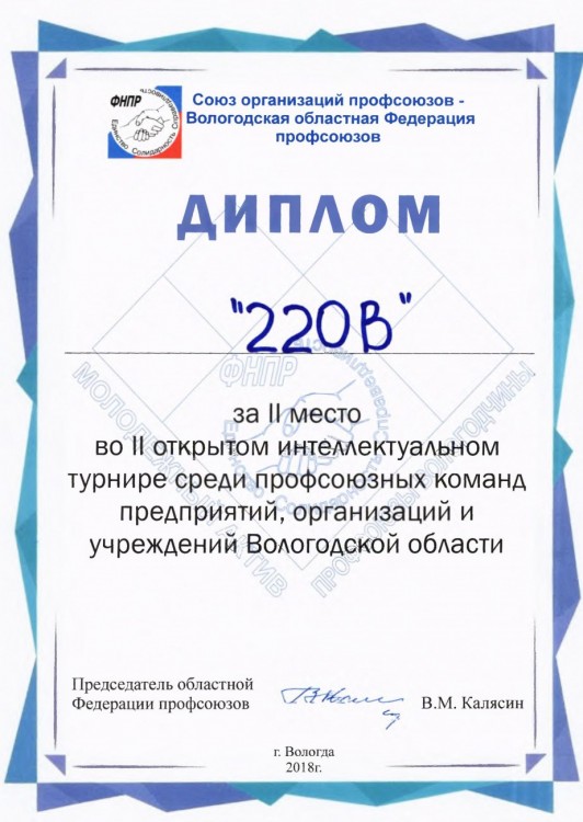 В итоге лучше всех с вопросами справилась команда «Не студенты ВПК» Вологодского педагогического колледжа, второе место заняла команда «220 Вольт», представлявшая «Вологдаэнерго», третье – команда Вологодского оптико-механического завода. После завершения турнира победители и призеры были награждены дипломами и призами.